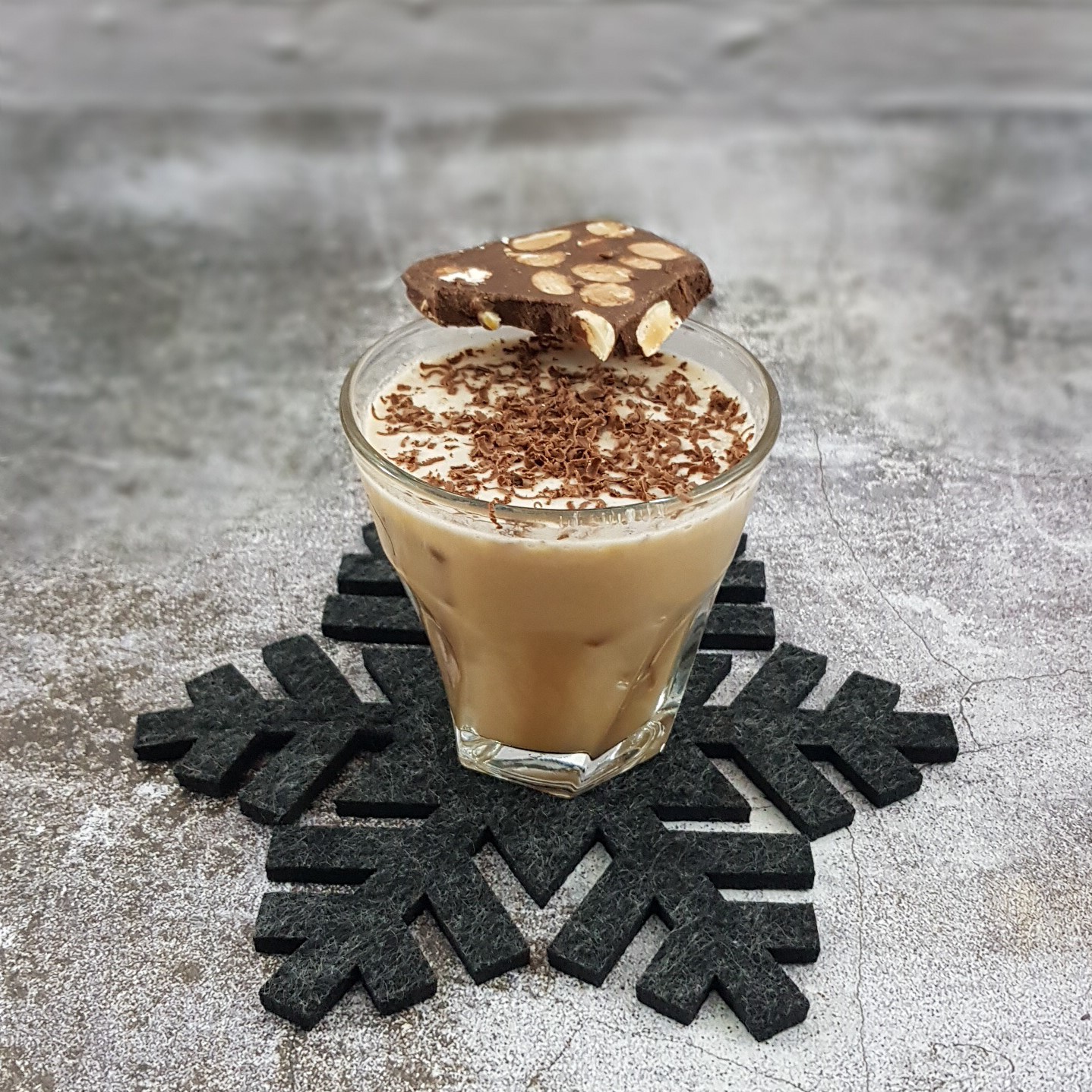 Decoración: Escamas medianas de chocolate negro. La presentación del cóctel en dos colores blanco y negro ayuda a la apariencia, al mezclar da un tono marrón claro muy atractivo.