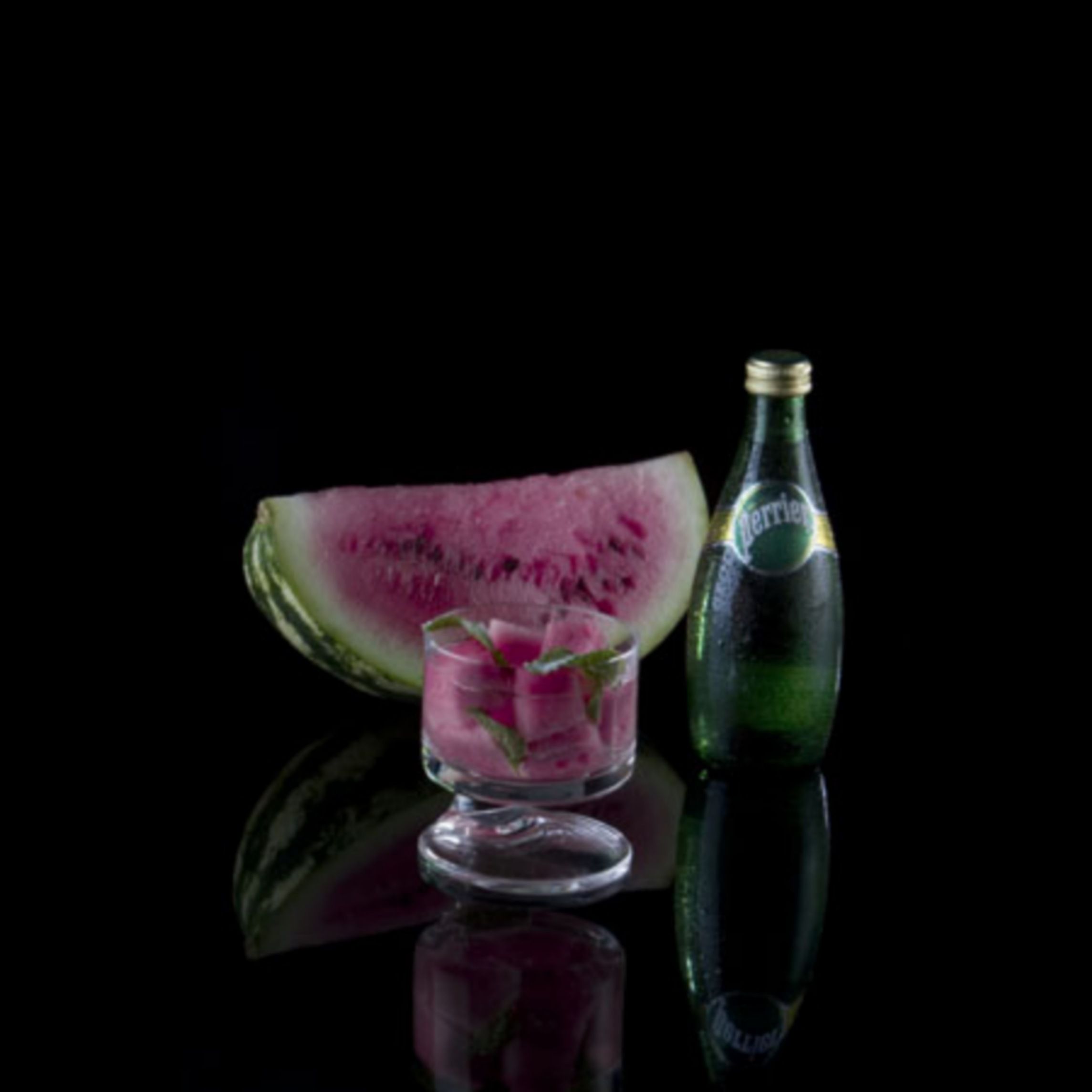 Preparación: Técnica Directo al vaso.Colador los cubos de sandía congelados en el vaso, agregar el Shrubs de Sandía (jarabe de vinagre), seguido completar con Perrier bien frío.