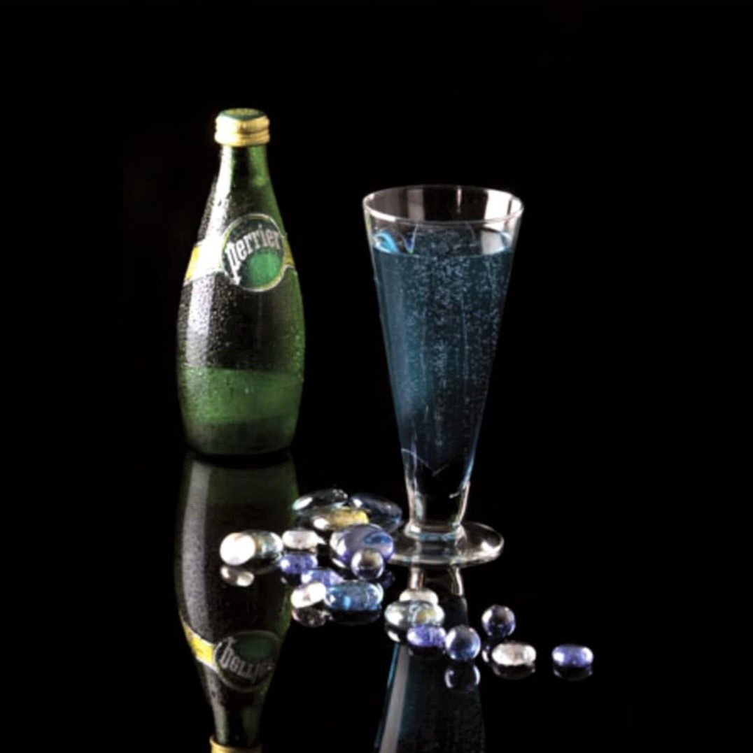 Preparación: Técnica Directo al Vaso. Tomar un vaso previamente enfriado, agregar el blue curaçao y completar con Perrier bien fría. Nota: No colocar hielo