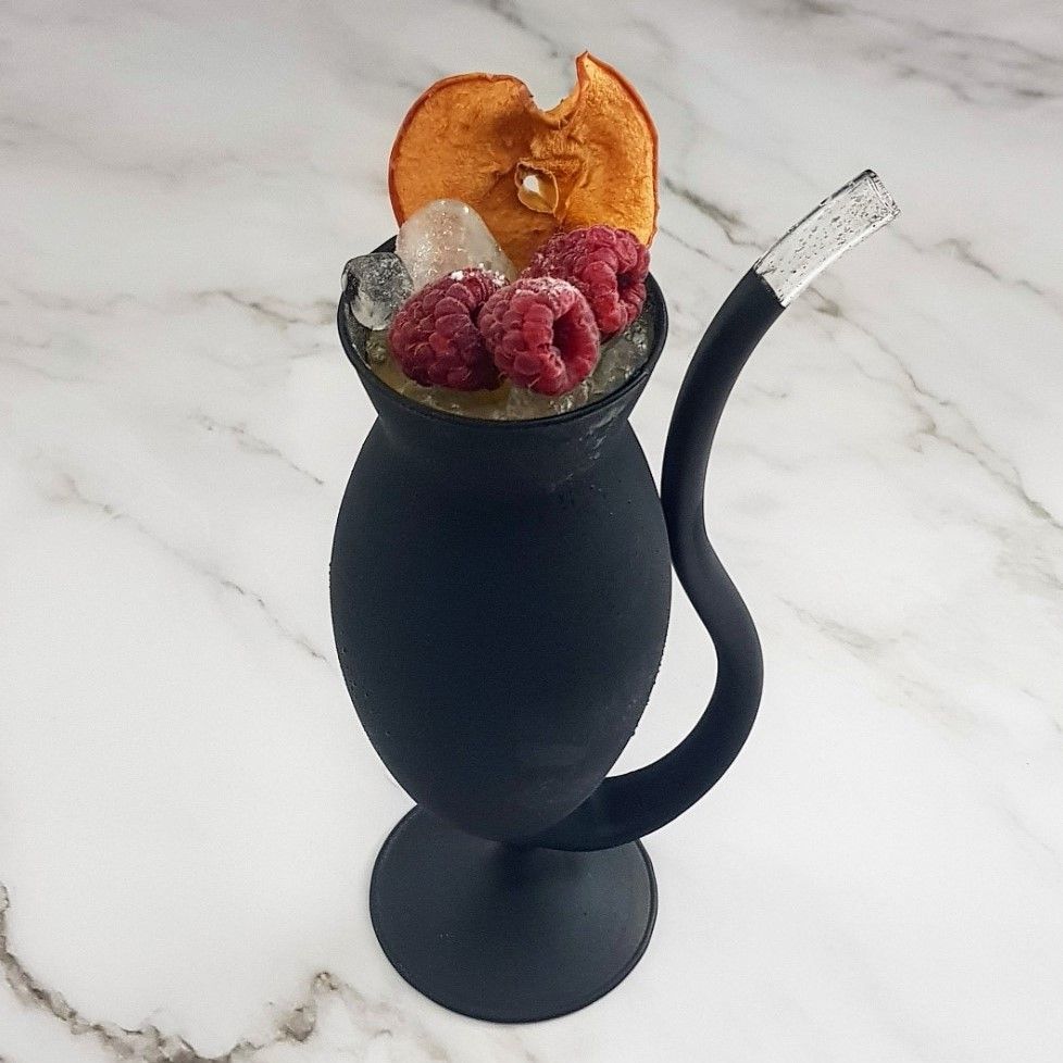 Decoración: Rodaja de manzana deshidratada o una brocheta comestible de frutas frescas. Colocar pajita (sorbete).
