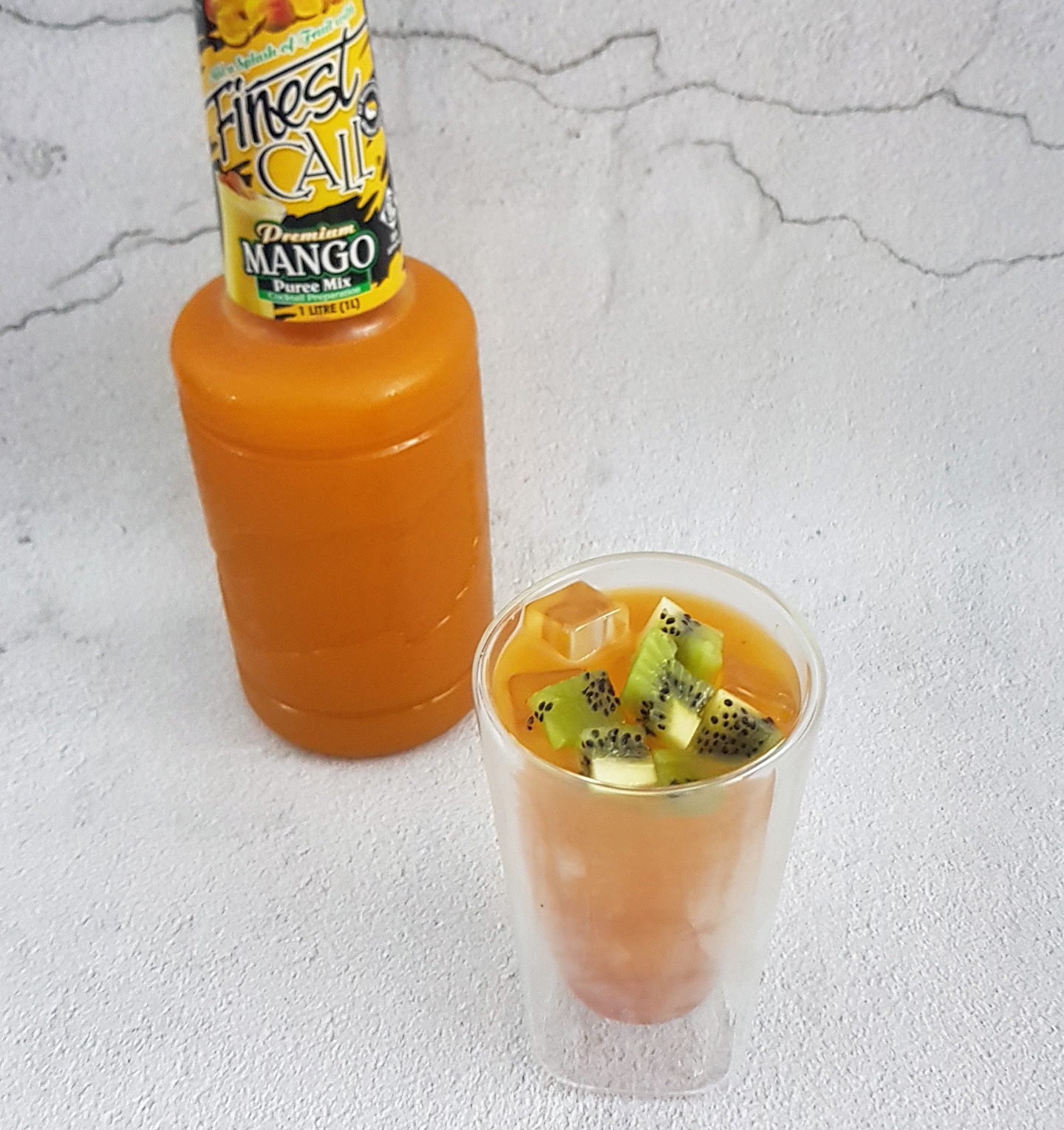 Decoración: Rodaja de mango fresco o dados de kiwi fresco. Colocar pajita (sorbete).
